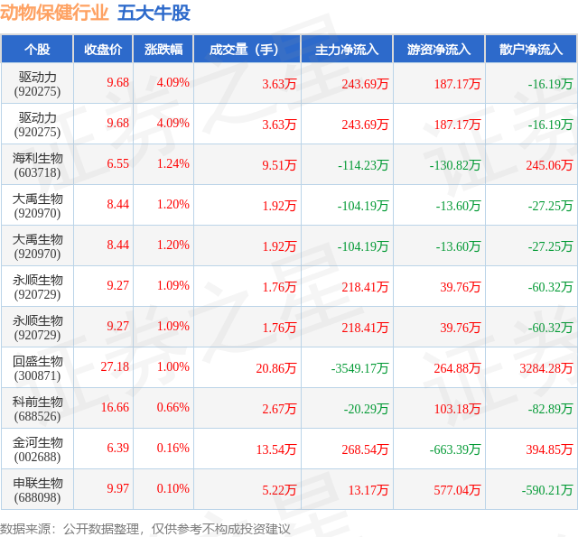 个股表现方面,动物保健行业当日领涨股为驱动力(920275),该股当日报收9.68,上涨4.09%,成交量3.63万,主力资金净流入243.69万元。驱动力(920275)以上涨4.09%紧随其后,该股当日成交量3.63万,主力资金净流入243.69万元。除此之外,海利生物(603718)、大禹生物(920970)、大禹生物(920970)均进入当日牛股之列。具体个股列表见下表: