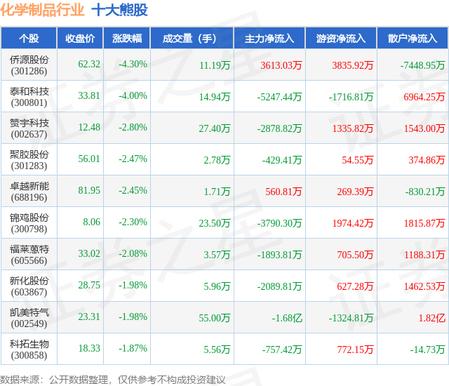 个股表现方面,化学制品行业当日领跌股为侨源股份(301286),该股当日报收62.32,下跌4.3%,成交量11.19万,主力资金净流入3613.03万元。泰和科技(300801)以下跌4.0%紧随其后,该股当日成交量14.94万,主力资金净流出5247.44万元。除此之外,赞宇科技(002637)、聚胶股份(301283)、卓越新能(688196)均进入当日熊股之列。具体个股列表见下表: