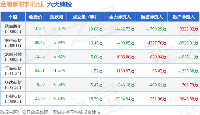 个股表现方面,金属新材料行业当日领跌股为图南股份(300855),该股当日报收37.64,下跌3.81%,成交量10.68万,主力资金净流出1422.73万元。铂科新材(300811)以下跌2.99%紧随其后,该股当日成交量13.45万,主力资金净流出400.85万元。除此之外,龙磁科技(300835)、江南新材(603124)、华达新材(605158)均进入当日熊股之列。具体个股列表见下表: