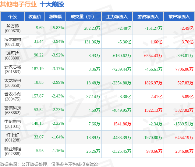 个股表现方面,其他电子行业当日领跌股为盈方微(000670),该股当日报收9.69,下跌5.83%,成交量282.23万,主力资金净流出2.48亿元。沃尔核材(002130)以下跌3.94%紧随其后,该股当日成交量131.06万,主力资金净流出5.36亿元。除此之外,瑞可达(688800)、云汉芯城(301563)、太龙股份(300650)均进入当日熊股之列。具体个股列表见下表: