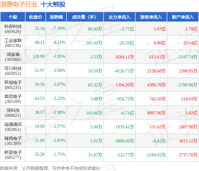 个股表现方面,消费电子行业当日领跌股为科森科技(603626),该股当日报收22.34,下跌7.3%,成交量86.0万,主力资金净流出2.77亿元。工业富联(601138)以下跌4.21%紧随其后,该股当日成交量203.3万,主力资金净流出26.33亿元。除此之外,鸿富瀚(301086)、可川科技(603052)、环旭电子(601231)均进入当日熊股之列。具体个股列表见下表: