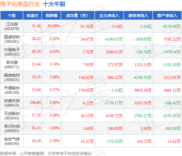 个股表现方面,电子化学品行业当日领涨股为江化微(603078),该股当日报收31.36,上涨10.0%,成交量91.56万,主力资金净流入3.14亿元。国瓷材料(300285)以上涨5.32%紧随其后,该股当日成交量54.07万,主力资金净流出6190.63万元。除此之外,兴福电子(688545)、菲沃泰(688371)、晶瑞电材(300655)均进入当日牛股之列。具体个股列表见下表: