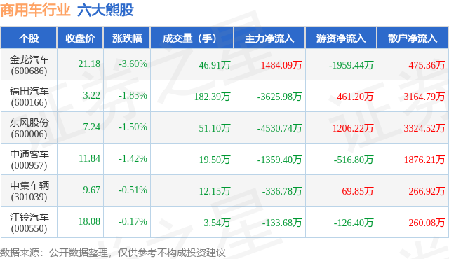 个股表现方面,商用车行业当日领跌股为金龙汽车(600686),该股当日报收21.18,下跌3.6%,成交量46.91万,主力资金净流入1484.09万元。福田汽车(600166)以下跌1.83%紧随其后,该股当日成交量182.39万,主力资金净流出3625.98万元。除此之外,东风股份(600006)、中通客车(000957)、中集车辆(301039)均进入当日熊股之列。具体个股列表见下表: