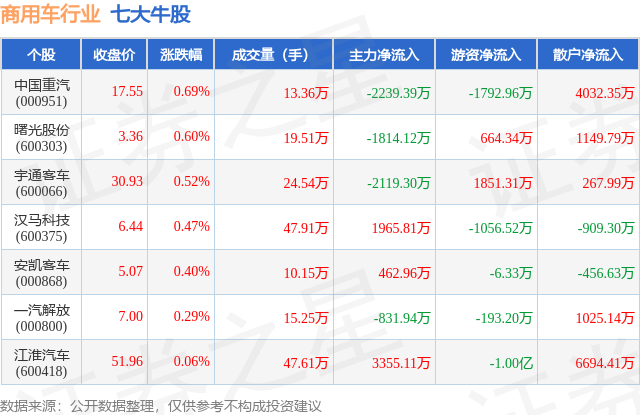 个股表现方面,商用车行业当日领涨股为中国重汽(000951),该股当日报收17.55,上涨0.69%,成交量13.36万,主力资金净流出2239.39万元。曙光股份(600303)以上涨0.6%紧随其后,该股当日成交量19.51万,主力资金净流出1814.12万元。除此之外,宇通客车(600066)、汉马科技(600375)、安凯客车(000868)均进入当日牛股之列。具体个股列表见下表: