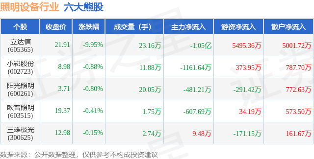 个股表现方面,照明设备行业当日领跌股为立达信(605365),该股当日报收21.91,下跌9.95%,成交量23.16万,主力资金净流出1.05亿元。小崧股份(002723)以下跌0.88%紧随其后,该股当日成交量11.88万,主力资金净流出1161.64万元。除此之外,阳光照明(600261)、欧普照明(603515)、三雄极光(300625)均进入当日熊股之列。具体个股列表见下表: