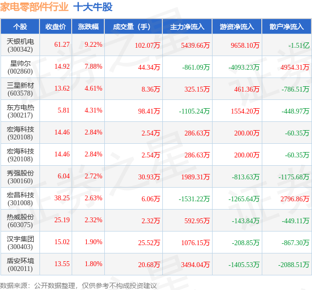 个股表现方面,家电零部件行业当日领涨股为天银机电(300342),该股当日报收61.27,上涨9.22%,成交量102.07万,主力资金净流入5439.66万元。星帅尔(002860)以上涨7.88%紧随其后,该股当日成交量44.34万,主力资金净流出861.09万元。除此之外,三星新材(603578)、东方电热(300217)、宏海科技(920108)均进入当日牛股之列。具体个股列表见下表: