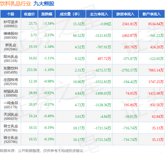 个股表现方面,饮料乳品行业当日领跌股为妙可蓝多(600882),该股当日报收23.75,下跌3.34%,成交量15.32万,主力资金净流出1.09亿元。维维股份(600300)以下跌2.11%紧随其后,该股当日成交量66.52万,主力资金净流出1121.65万元。除此之外,新乳业(002946)、阳光乳业(001318)、东鹏饮料(605499)均进入当日熊股之列。具体个股列表见下表: