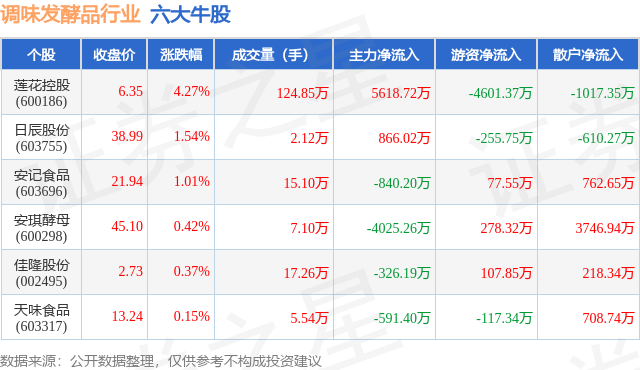个股表现方面,调味发酵品行业当日领涨股为莲花控股(600186),该股当日报收6.35,上涨4.27%,成交量124.85万,主力资金净流入5618.72万元。日辰股份(603755)以上涨1.54%紧随其后,该股当日成交量2.12万,主力资金净流入866.02万元。除此之外,安记食品(603696)、安琪酵母(600298)、佳隆股份(002495)均进入当日牛股之列。具体个股列表见下表: