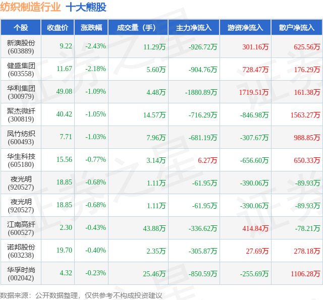 个股表现方面,纺织制造行业当日领跌股为新澳股份(603889),该股当日报收9.22,下跌2.43%,成交量11.29万,主力资金净流出926.72万元。健盛集团(603558)以下跌2.18%紧随其后,该股当日成交量5.6万,主力资金净流出904.76万元。除此之外,华利集团(300979)、聚杰微纤(300819)、凤竹纺织(600493)均进入当日熊股之列。具体个股列表见下表: