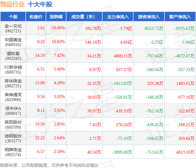 个股表现方面,饰品行业当日领涨股为金一文化(002721),该股当日报收3.61,上涨10.06%,成交量105.78万,主力资金净流入1.79亿元。中国黄金(600916)以上涨10.02%紧随其后,该股当日成交量146.1万,主力资金净流入4.05亿元。除此之外,潮宏基(002345)、ST新华锦(600735)、萃华珠宝(002731)均进入当日牛股之列。具体个股列表见下表: