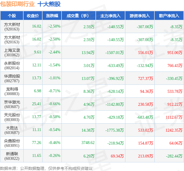 个股表现方面,包装印刷行业当日领跌股为方大新材(920163),该股当日报收16.02,下跌2.5%,成交量2.59万,主力资金净流出140.55万元。方大新材(920163)以下跌2.5%紧随其后,该股当日成交量2.59万,主力资金净流出140.55万元。除此之外,上海艾录(301062)、永新股份(002014)、华源控股(002787)均进入当日熊股之列。具体个股列表见下表: