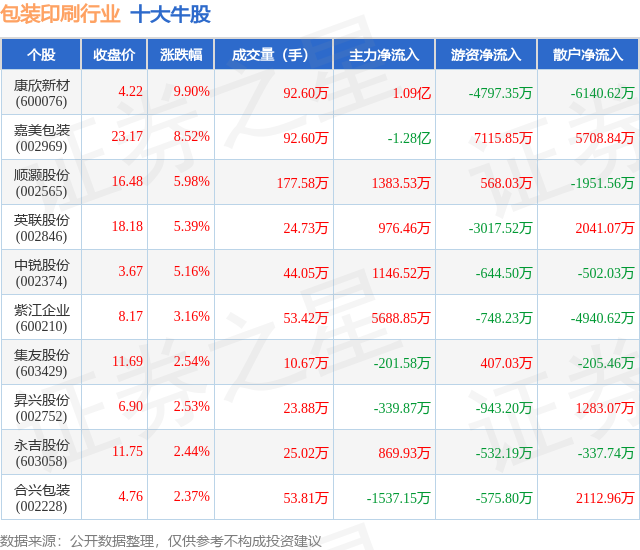 个股表现方面,包装印刷行业当日领涨股为康欣新材(600076),该股当日报收4.22,上涨9.9%,成交量92.6万,主力资金净流入1.09亿元。嘉美包装(002969)以上涨8.52%紧随其后,该股当日成交量92.6万,主力资金净流出1.28亿元。除此之外,顺灏股份(002565)、英联股份(002846)、中锐股份(002374)均进入当日牛股之列。具体个股列表见下表: