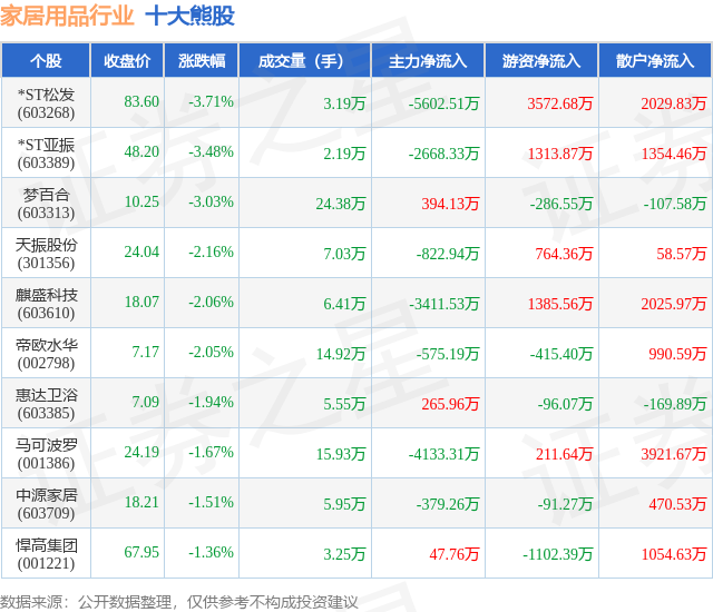 个股表现方面,家居用品行业当日领跌股为*ST松发(603268),该股当日报收83.6,下跌3.71%,成交量3.19万,主力资金净流出5602.51万元。*ST亚振(603389)以下跌3.48%紧随其后,该股当日成交量2.19万,主力资金净流出2668.33万元。除此之外,梦百合(603313)、天振股份(301356)、麒盛科技(603610)均进入当日熊股之列。具体个股列表见下表: