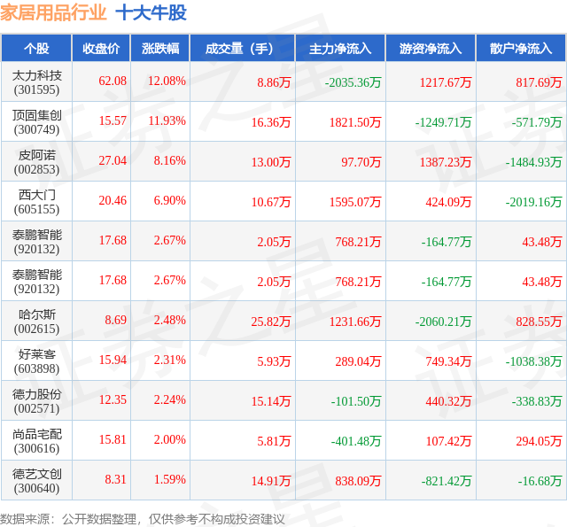 个股表现方面,家居用品行业当日领涨股为太力科技(301595),该股当日报收62.08,上涨12.08%,成交量8.86万,主力资金净流出2035.36万元。顶固集创(300749)以上涨11.93%紧随其后,该股当日成交量16.36万,主力资金净流入1821.5万元。除此之外,皮阿诺(002853)、西大门(605155)、泰鹏智能(920132)均进入当日牛股之列。具体个股列表见下表: