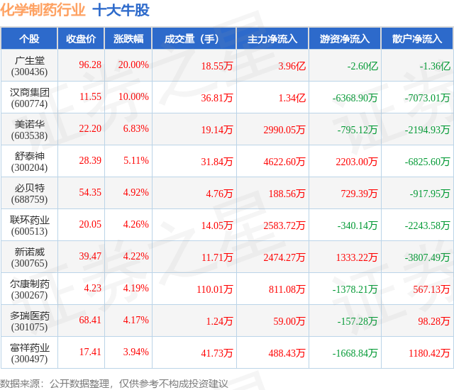 个股表现方面,化学制药行业当日领涨股为广生堂(300436),该股当日报收96.28,上涨20.0%,成交量18.55万,主力资金净流入3.96亿元。汉商集团(600774)以上涨10.0%紧随其后,该股当日成交量36.81万,主力资金净流入1.34亿元。除此之外,美诺华(603538)、舒泰神(300204)、必贝特(688759)均进入当日牛股之列。具体个股列表见下表: