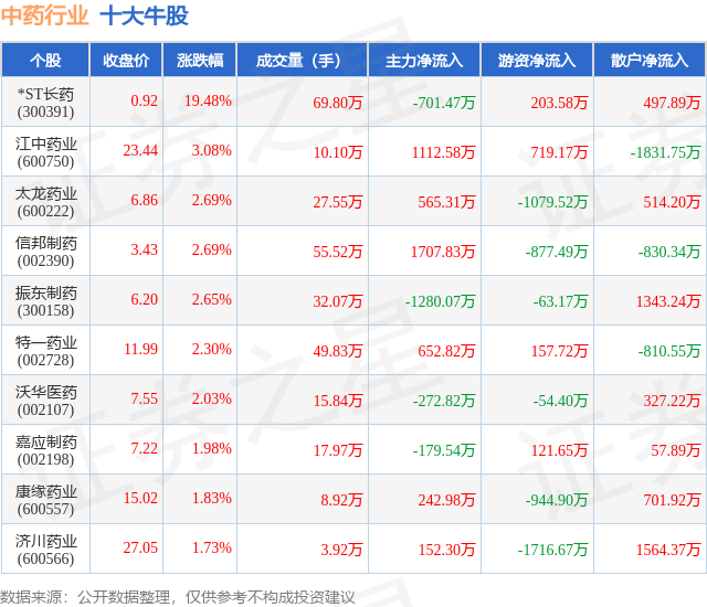 个股表现方面,中药行业当日领涨股为*ST长药(300391),该股当日报收0.92,上涨19.48%,成交量69.8万,主力资金净流出701.47万元。江中药业(600750)以上涨3.08%紧随其后,该股当日成交量10.1万,主力资金净流入1112.58万元。除此之外,太龙药业(600222)、信邦制药(002390)、振东制药(300158)均进入当日牛股之列。具体个股列表见下表: