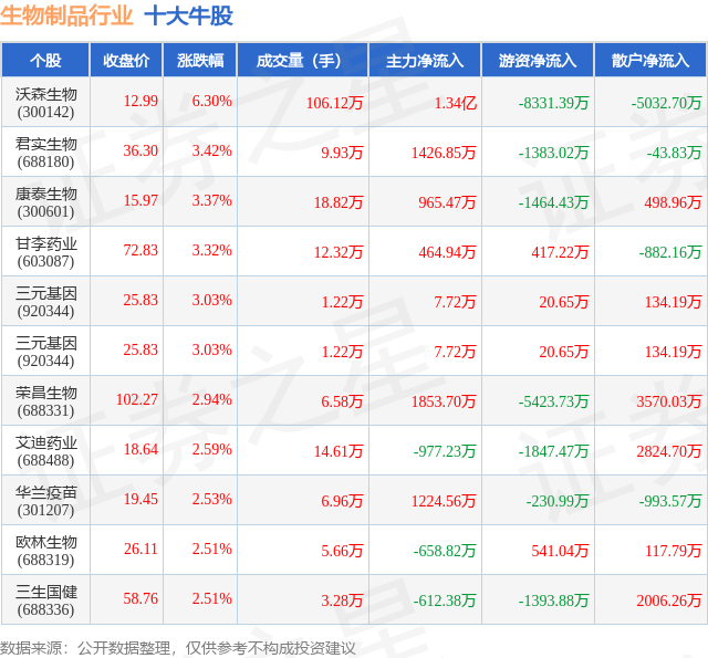 个股表现方面,生物制品行业当日领涨股为沃森生物(300142),该股当日报收12.99,上涨6.3%,成交量106.12万,主力资金净流入1.34亿元。君实生物(688180)以上涨3.42%紧随其后,该股当日成交量9.93万,主力资金净流入1426.85万元。除此之外,康泰生物(300601)、甘李药业(603087)、三元基因(920344)均进入当日牛股之列。具体个股列表见下表:
