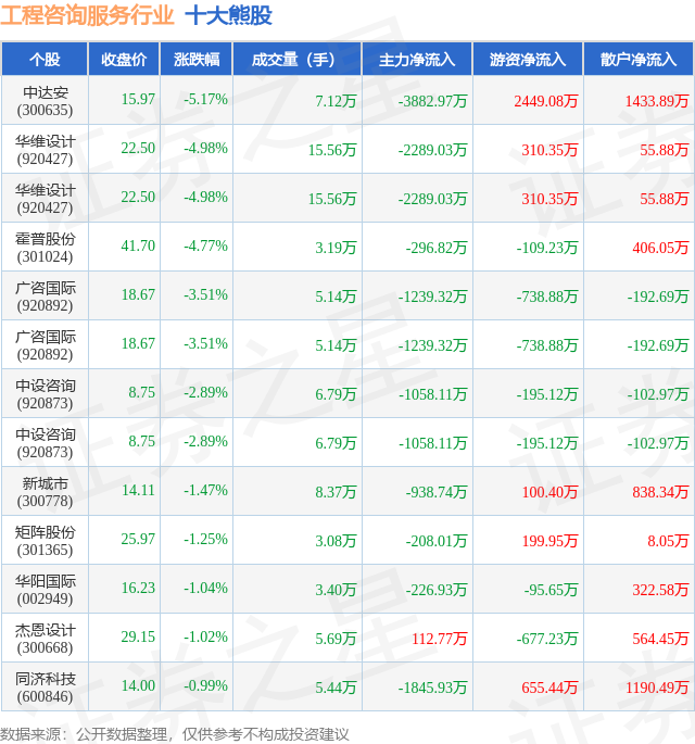 个股表现方面,工程咨询服务行业当日领跌股为中达安(300635),该股当日报收15.97,下跌5.17%,成交量7.12万,主力资金净流出3882.97万元。华维设计(920427)以下跌4.98%紧随其后,该股当日成交量15.56万,主力资金净流出2289.03万元。除此之外,华维设计(920427)、霍普股份(301024)、广咨国际(920892)均进入当日熊股之列。具体个股列表见下表: