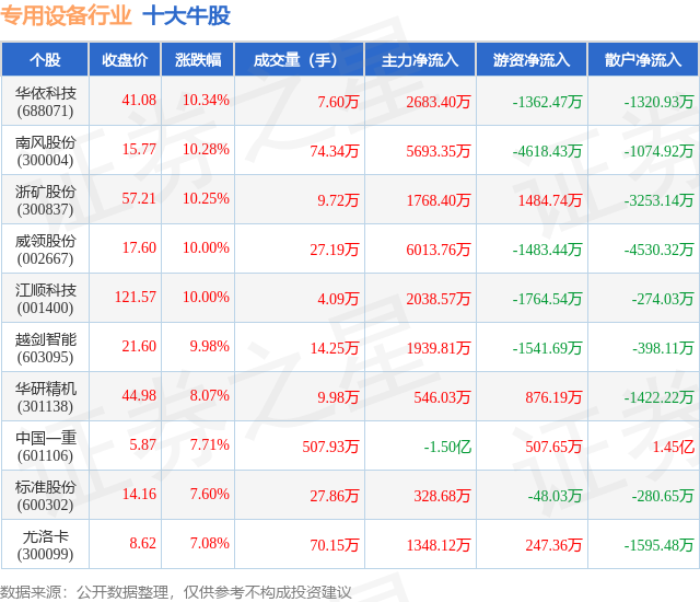 个股表现方面,专用设备行业当日领涨股为华依科技(688071),该股当日报收41.08,上涨10.34%,成交量7.6万,主力资金净流入2683.4万元。南风股份(300004)以上涨10.28%紧随其后,该股当日成交量74.34万,主力资金净流入5693.35万元。除此之外,浙矿股份(300837)、威领股份(002667)、江顺科技(001400)均进入当日牛股之列。具体个股列表见下表: