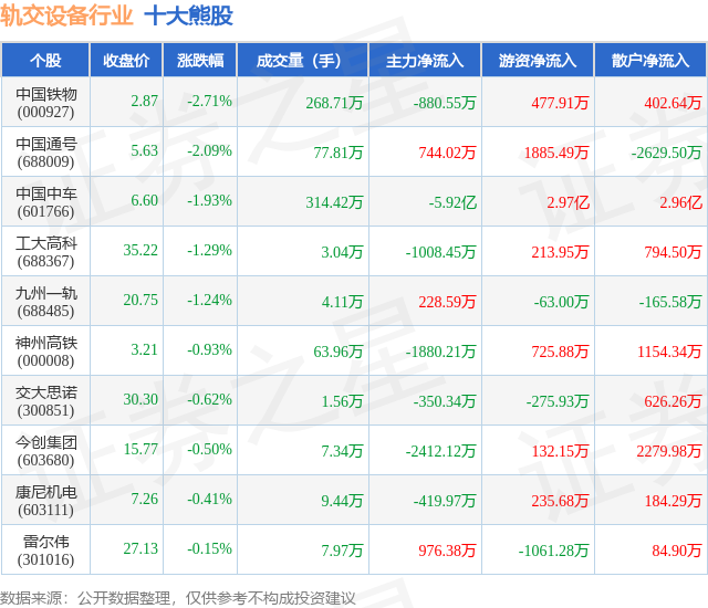 个股表现方面,轨交设备行业当日领跌股为中国铁物(000927),该股当日报收2.87,下跌2.71%,成交量268.71万,主力资金净流出880.55万元。中国通号(688009)以下跌2.09%紧随其后,该股当日成交量77.81万,主力资金净流入744.02万元。除此之外,中国中车(601766)、工大高科(688367)、九州一轨(688485)均进入当日熊股之列。具体个股列表见下表: