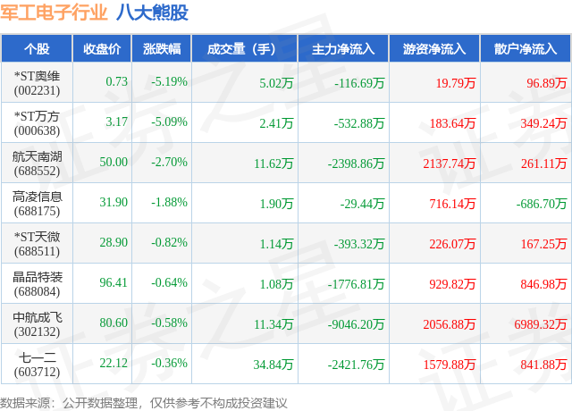 个股表现方面,军工电子行业当日领跌股为*ST奥维(002231),该股当日报收0.73,下跌5.19%,成交量5.02万,主力资金净流出116.69万元。*ST万方(000638)以下跌5.09%紧随其后,该股当日成交量2.41万,主力资金净流出532.88万元。除此之外,航天南湖(688552)、高凌信息(688175)、*ST天微(688511)均进入当日熊股之列。具体个股列表见下表: