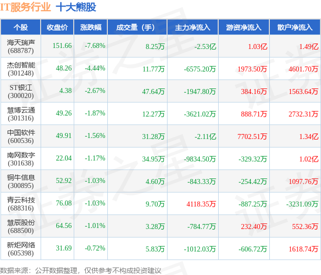 个股表现方面,IT服务行业当日领跌股为海天瑞声(688787),该股当日报收151.66,下跌7.68%,成交量8.25万,主力资金净流出2.53亿元。杰创智能(301248)以下跌4.44%紧随其后,该股当日成交量11.77万,主力资金净流出6575.2万元。除此之外,ST银江(300020)、慧博云通(301316)、中国软件(600536)均进入当日熊股之列。具体个股列表见下表: