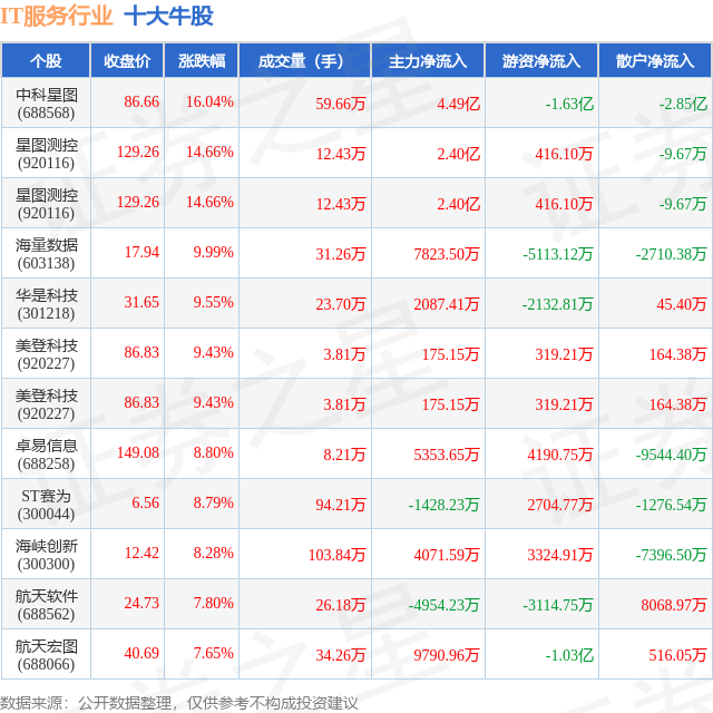 个股表现方面,IT服务行业当日领涨股为中科星图(688568),该股当日报收86.66,上涨16.04%,成交量59.66万,主力资金净流入4.49亿元。星图测控(920116)以上涨14.66%紧随其后,该股当日成交量12.43万,主力资金净流入2.4亿元。除此之外,星图测控(920116)、海量数据(603138)、华是科技(301218)均进入当日牛股之列。具体个股列表见下表: