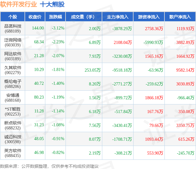 个股表现方面,软件开发行业当日领跌股为品茗科技(688109),该股当日报收144.0,下跌3.12%,成交量2.0万,主力资金净流出3878.29万元。泛微网络(603039)以下跌2.23%紧随其后,该股当日成交量6.89万,主力资金净流入2108.04万元。除此之外,网达软件(603189)、久其软件(002279)、概伦电子(688206)均进入当日熊股之列。具体个股列表见下表: