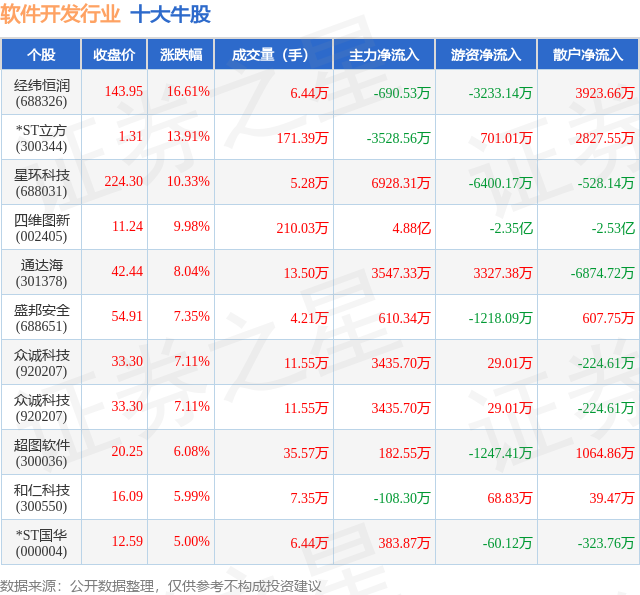 个股表现方面,软件开发行业当日领涨股为经纬恒润(688326),该股当日报收143.95,上涨16.61%,成交量6.44万,主力资金净流出690.53万元。*ST立方(300344)以上涨13.91%紧随其后,该股当日成交量171.39万,主力资金净流出3528.56万元。除此之外,星环科技(688031)、四维图新(002405)、通达海(301378)均进入当日牛股之列。具体个股列表见下表: