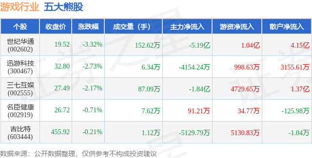 个股表现方面,游戏行业当日领跌股为世纪华通(002602),该股当日报收19.52,下跌3.32%,成交量152.62万,主力资金净流出5.19亿元。迅游科技(300467)以下跌2.73%紧随其后,该股当日成交量6.34万,主力资金净流出4154.24万元。除此之外,三七互娱(002555)、名臣健康(002919)、吉比特(603444)均进入当日熊股之列。具体个股列表见下表: