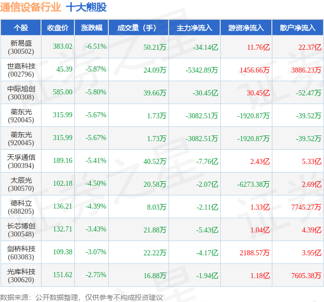 个股表现方面,通信设备行业当日领跌股为新易盛(300502),该股当日报收383.02,下跌6.51%,成交量50.21万,主力资金净流出34.14亿元。世嘉科技(002796)以下跌5.87%紧随其后,该股当日成交量24.09万,主力资金净流出5342.89万元。除此之外,中际旭创(300308)、蘅东光(920045)、蘅东光(920045)均进入当日熊股之列。具体个股列表见下表:
