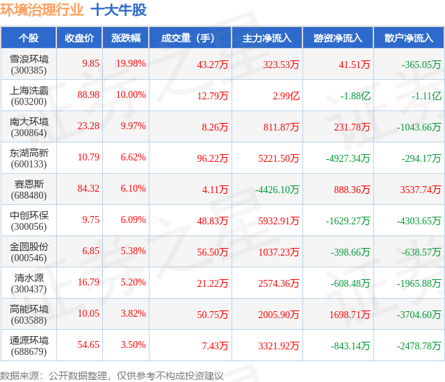 个股表现方面,环境治理行业当日领涨股为雪浪环境(300385),该股当日报收9.85,上涨19.98%,成交量43.27万,主力资金净流入323.53万元。上海洗霸(603200)以上涨10.0%紧随其后,该股当日成交量12.79万,主力资金净流入2.99亿元。除此之外,南大环境(300864)、东湖高新(600133)、赛恩斯(688480)均进入当日牛股之列。具体个股列表见下表: