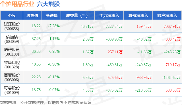 个股表现方面,个护用品行业当日领跌股为延江股份(300658),该股当日报收18.22,下跌7.28%,成交量46.71万,主力资金净流出7227.34万元。倍加洁(603059)以下跌1.17%紧随其后,该股当日成交量2.59万,主力资金净流出339.9万元。除此之外,洁雅股份(301108)、登康口腔(001328)、百亚股份(003006)均进入当日熊股之列。具体个股列表见下表: