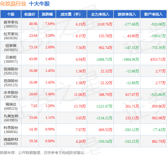 个股表现方面,化妆品行业当日领涨股为嘉亨家化(300955),该股当日报收40.06,上涨7.69%,成交量6.19万,主力资金净流入1110.76万元。拉芳家化(603630)以上涨3.28%紧随其后,该股当日成交量8.37万,主力资金净流入155.78万元。除此之外,珀莱雅(603605)、贝泰妮(300957)、芭薇股份(920123)均进入当日牛股之列。具体个股列表见下表: