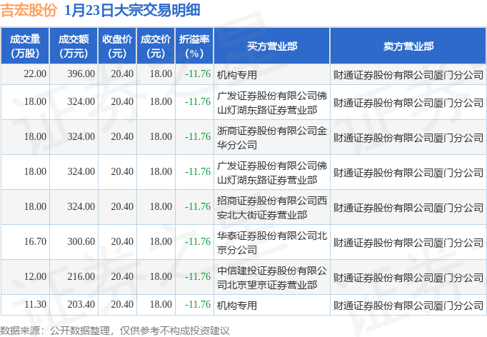 证券之星消息,1月23日吉宏股份发生大宗交易,交易数据如下: