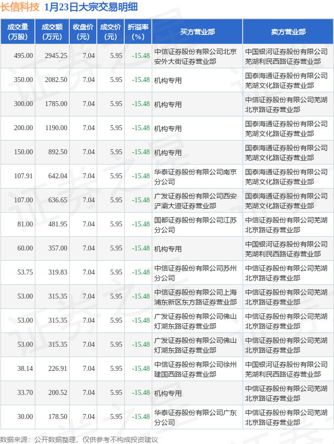 证券之星消息,1月23日长信科技发生大宗交易,交易数据如下: