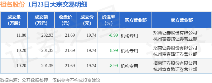 证券之星消息,1月23日祖名股份发生大宗交易,交易数据如下: