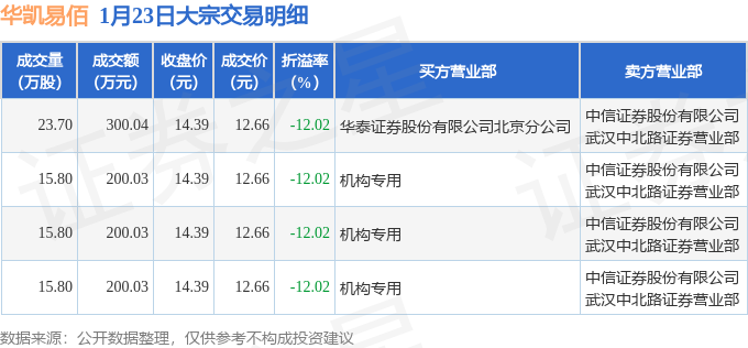 证券之星消息,1月23日华凯易佰发生大宗交易,交易数据如下: