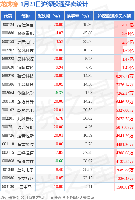龙虎榜中有沪股通/深股通专用席位(北向资金)现身的个股共35家,其中捷佳伟创以净买入4.15亿元排名第一。详情见下表: