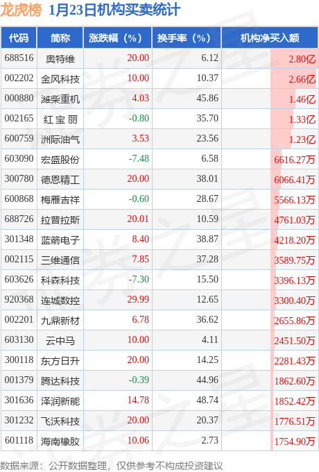 当日公布的交易所龙虎榜中有机构专用席位现身的个股共43家,其中奥特维以净买入2.8亿元排名第一。详情见下表: