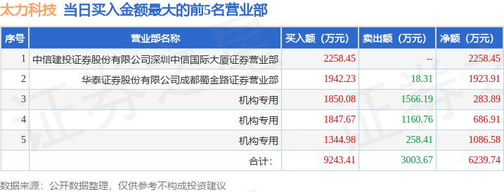 证券之星消息,沪深交易所2026年1月23日公布的交易公开信息显示,太力科技(301595)因日换手率达到30%的前5只证券登上龙虎榜。此次是近5个交易日内第1次上榜。