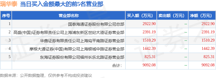 证券之星消息,沪深交易所2026年1月23日公布的交易公开信息显示,瑞华泰(688323)因有价格涨跌幅限制的日收盘价格涨幅达到15%的前五只证券登上龙虎榜。此次是近5个交易日内第1次上榜。
