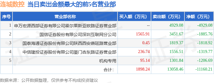 证券之星消息,沪深交易所2026年1月23日公布的交易公开信息显示,连城数控(920368)因当日收盘价涨幅达到20%的前5只股票登上龙虎榜。此次是近5个交易日内第1次上榜。