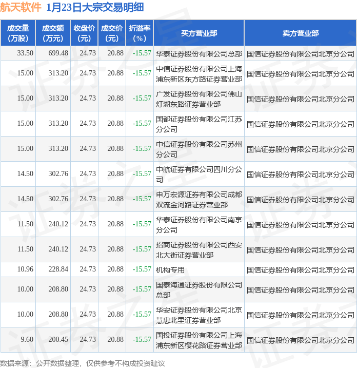 证券之星消息,1月23日航天软件发生大宗交易,交易数据如下: