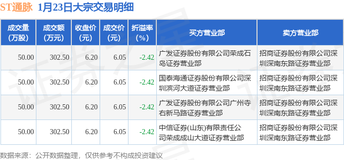 证券之星消息,1月23日ST通脉发生大宗交易,交易数据如下: