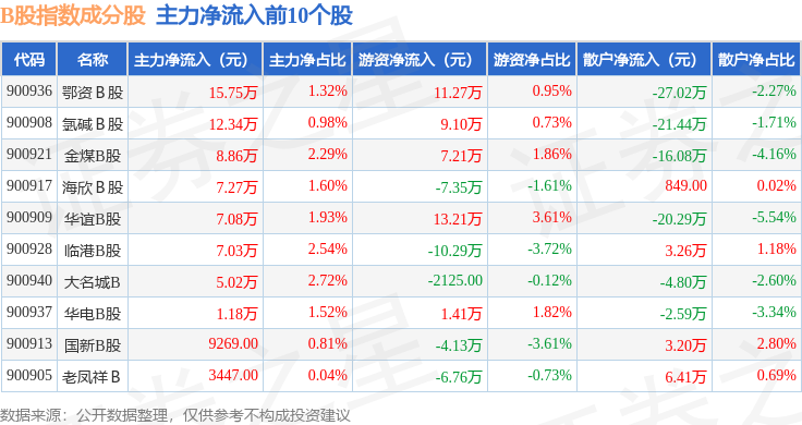 资金流向方面,B股指数(000003)成份股当日主力资金净流出合计26.52万元,游资资金净流入合计36.62万元,散户资金净流出合计10.1万元。成份股资金流向详情见下表: