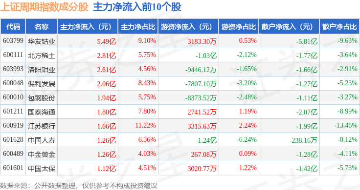 资金流向方面,上证周期(000063)指数成份股当日主力资金净流出合计18.45亿元,游资资金净流入合计4.1亿元,散户资金净流入合计14.35亿元。成份股资金流向详情见下表: