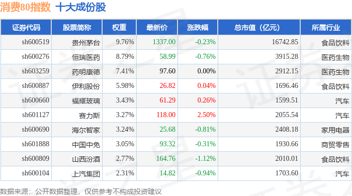 消费80(000069)指数十大成份股详情如下: