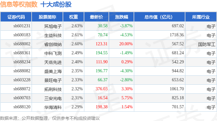 证券之星消息,1月23日,信息等权(000077)指数报收于6989.73点,涨0.63%,成交1592.85亿元,换手率2.77%。当日该指数成份股中,上涨的有28家,睿创微纳以20.0%的涨幅领涨,下跌的有21家,澜起科技以4.69%的跌幅领跌。