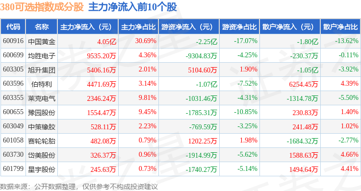 资金流向方面,380可选(000107)指数成份股当日主力资金净流入合计1794.74万元,游资资金净流出合计3.98亿元,散户资金净流入合计3.8亿元。成份股资金流向详情见下表: